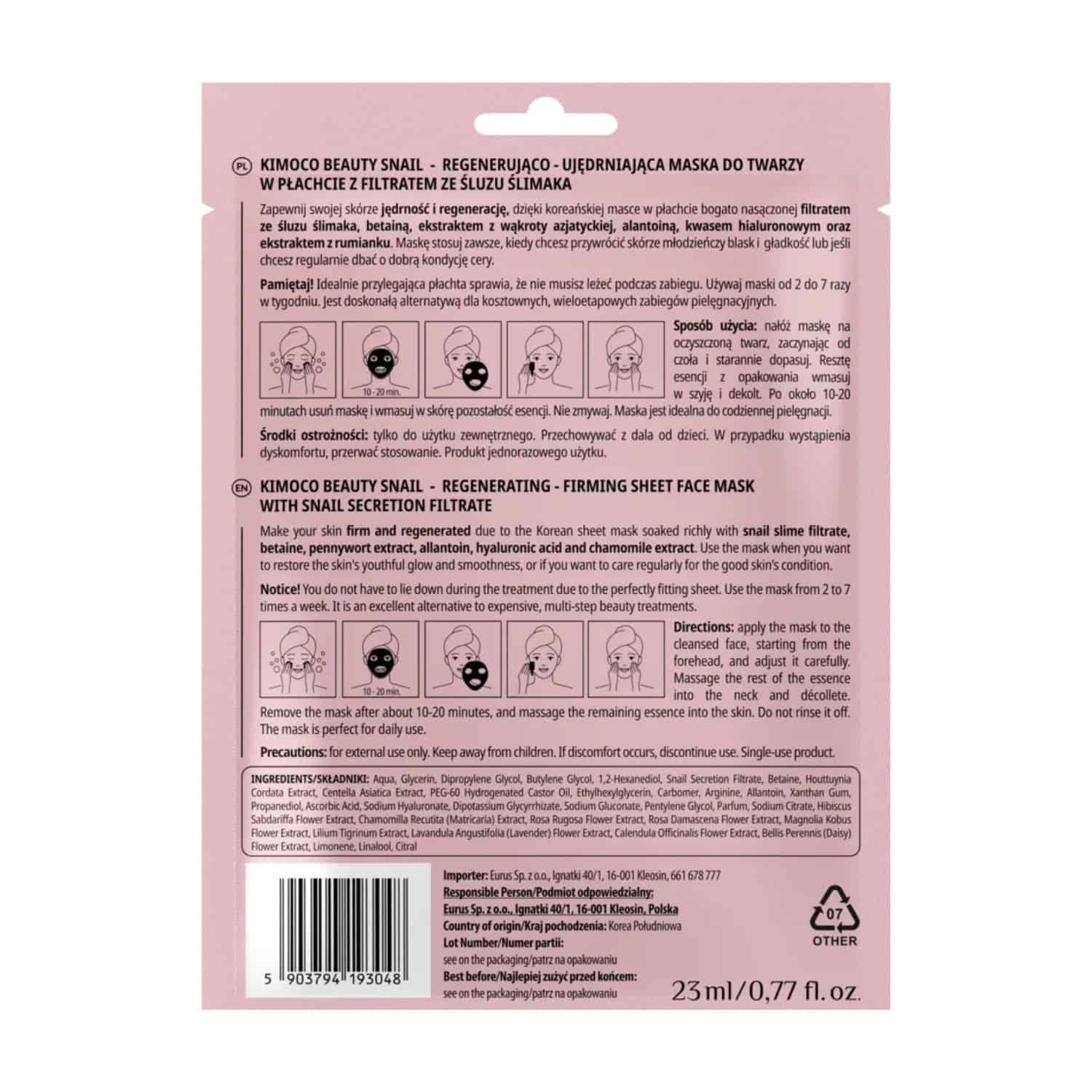 KIMOCO Beauty-Αναπλαστική και Συσφικτική Μάσκα Προσώπου με Βλέννα Σαλιγκαριού, 23ml